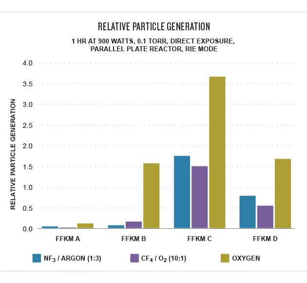 Fabricators have found that plasma is a very powerful tool for etching, CVD and stripping because all materials are consumed. FFKM seals are used in these processes because of their exceptional resistance to aggressive media. Prolonged exposure to plasmas can degrade seal surfaces resulting in particulate contamination even before sealing functionality is lost. The ideal seal, therefore, would resist surface degradation while maintaining sealing functionality.FFKM seals are designed to with stand chemical attack and provide extended seal life. They exhibit low weight lossand particle generation, thus improving wafer yield,increasing process reliability and reducing frequency of equipment maintenance. See the relative particle generation in plasma for four FFKM compounds.