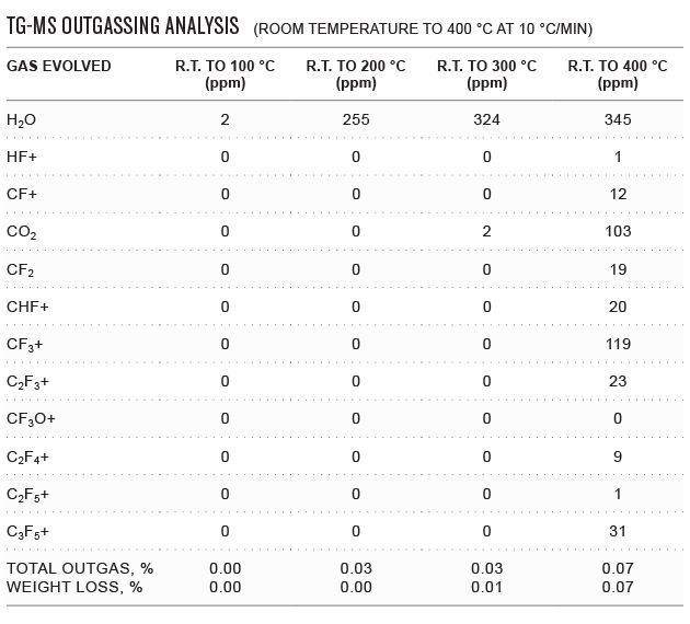 High heat and temperature spikes can “cook” elastomeric seals causing them to become hard and brittle. When this occurs, their crosslink structure, the key to elasticity, becomes irreversibly damaged making effective sealing impossible. Elastomers can also degrade under high temperatures, causing outgassing to occur, thereby contaminating the process environment. Thermal processes like oxidation and diffusion need seals that resist not only the process chemicals, but also the extreme temperatures required. Reliable, in-service temperature ratings for sealing materials are best defined by long-term (672 hour) testing for seal force retention. See extremely low outgassing properties of a typical FFKM compound from room temperature up to 400°C.