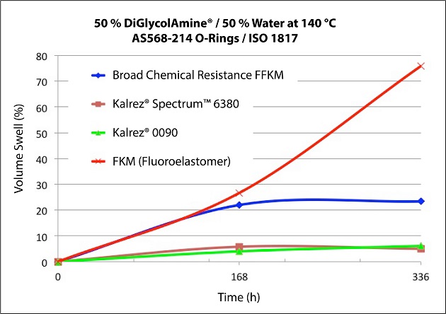 Kalrez® Spectrum 6380 parts offer outstanding resistance to amines and strong oxidizers at high temperatures in gas sweetening processes, and exhibit 10 to 15 times lower swell than FKM, and four times lower swell than general purpose FFKM in such environments.